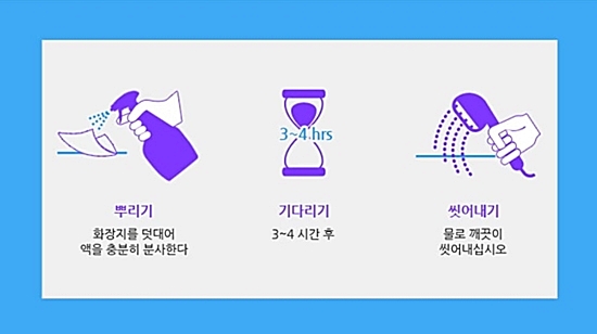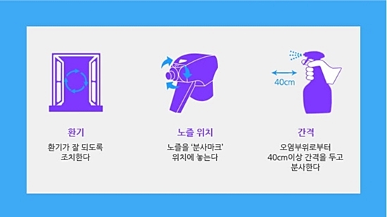 환기가 잘되도록 조치한다 -> 노즐을 분사 위치에 놓고 -> 오염부위로부터 40cm이상 간격을 두고 분사한다